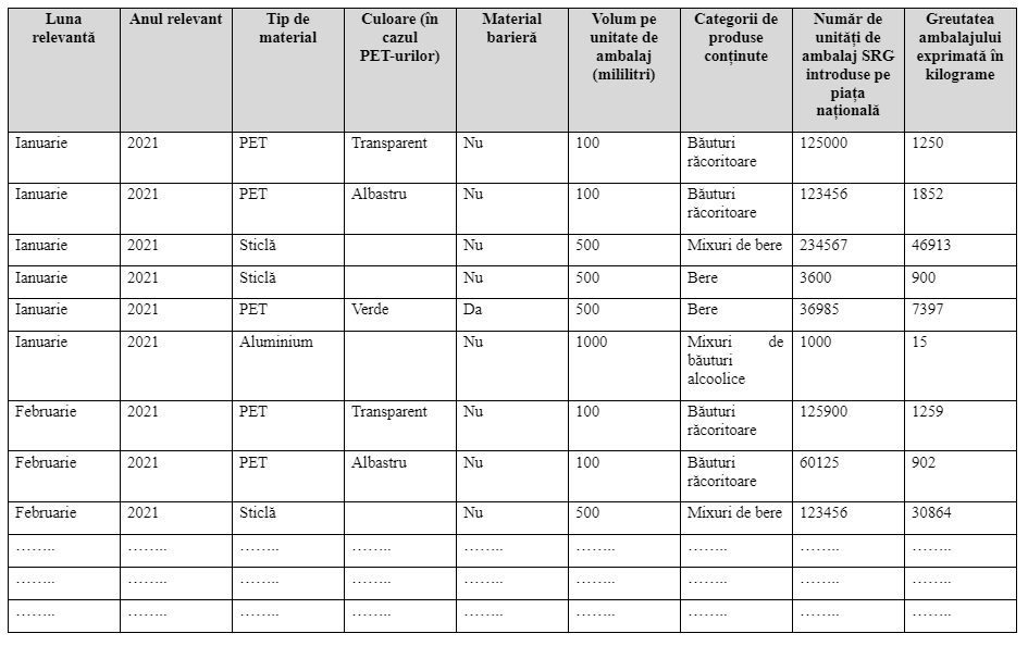 Numărul de unităţi de Ambalaje SGR şi greutatea aferentă de ambalaj exprimată în kilograme, introduse pe piaţa naţională în anul calendaristic anterior, defalcate dupa cum urmeaza: